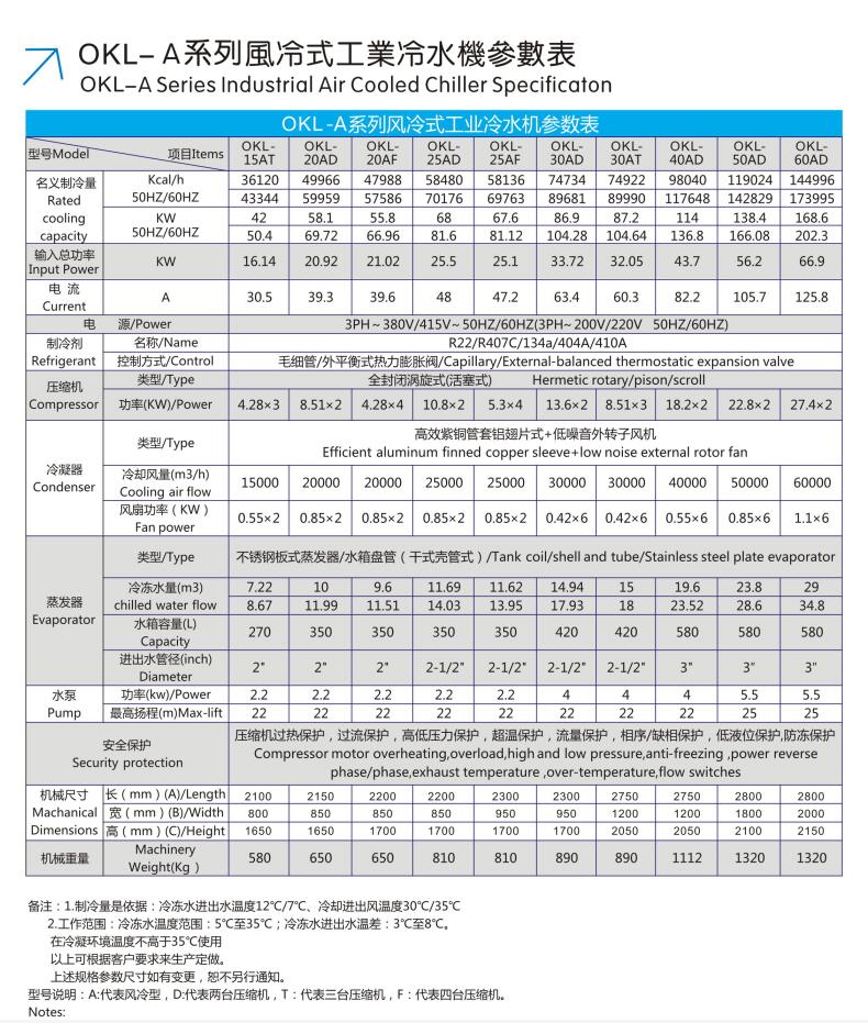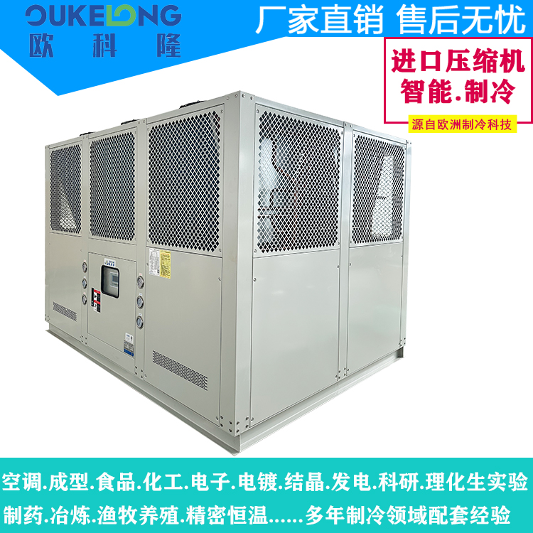 欧科隆制冷60HP风冷式冷水机型号是:OKL-60AT,是一款工业级大功率制冷设备,专为连续高负荷生产环境设计。该机型采用创新风冷散热架构,突破性实现60匹(约180kW)制冷能力,无需配置冷却塔,大幅降低用水成本和安装复杂度。