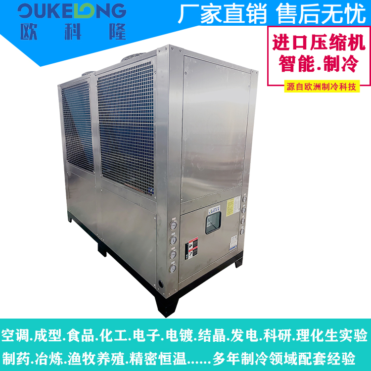 欧科隆制冷40HP风冷式冷水机是一款大功率工业制冷设备,专为重型制造和连续生产需求设计。该机型采用创新风冷技术,实现40匹(约120kW)强劲制冷量,突破传统水冷系统限制,显著降低安装维护成本。