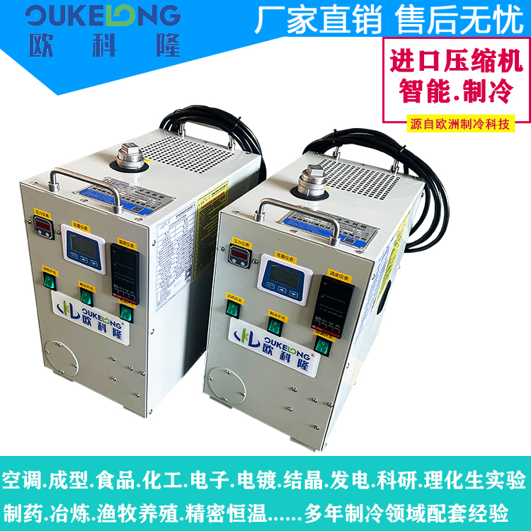 欧科隆制冷自主为国内知名企业研发定制的50W微型冷热一体测试机是一款紧凑型高精度温控设备,专为小型电子元件、传感器、芯片模组等微型器件的可靠性测试而设计。核心特点如下: